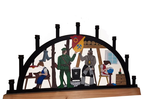 1985 wurde der einzige Schwibbogen, der einem Stollenmundloch nachempfunden ist gebaut. Zu sehen ein Bergmann und Schmelzmeister/ Hüttenarbeiter.